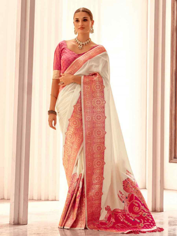 White Banarasi Soft Silk Jacquard Festival Wear Fancy Heavy Border Saree