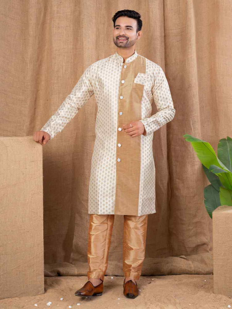 • Cream Jacquard Embroidery Festival Wedding Party Mens Kurta
