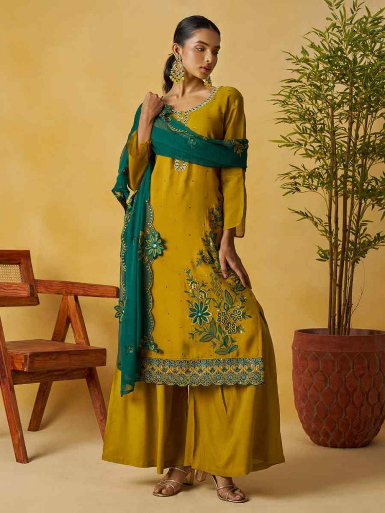 Color | Kameez : Mustaed Bottom : Mustaed Dupatta : Teal Blue |