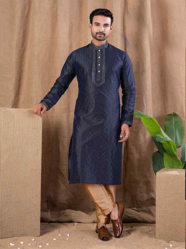 • Navy Blue Jacquard Embroidery Festival Wedding Party Mens Kurta